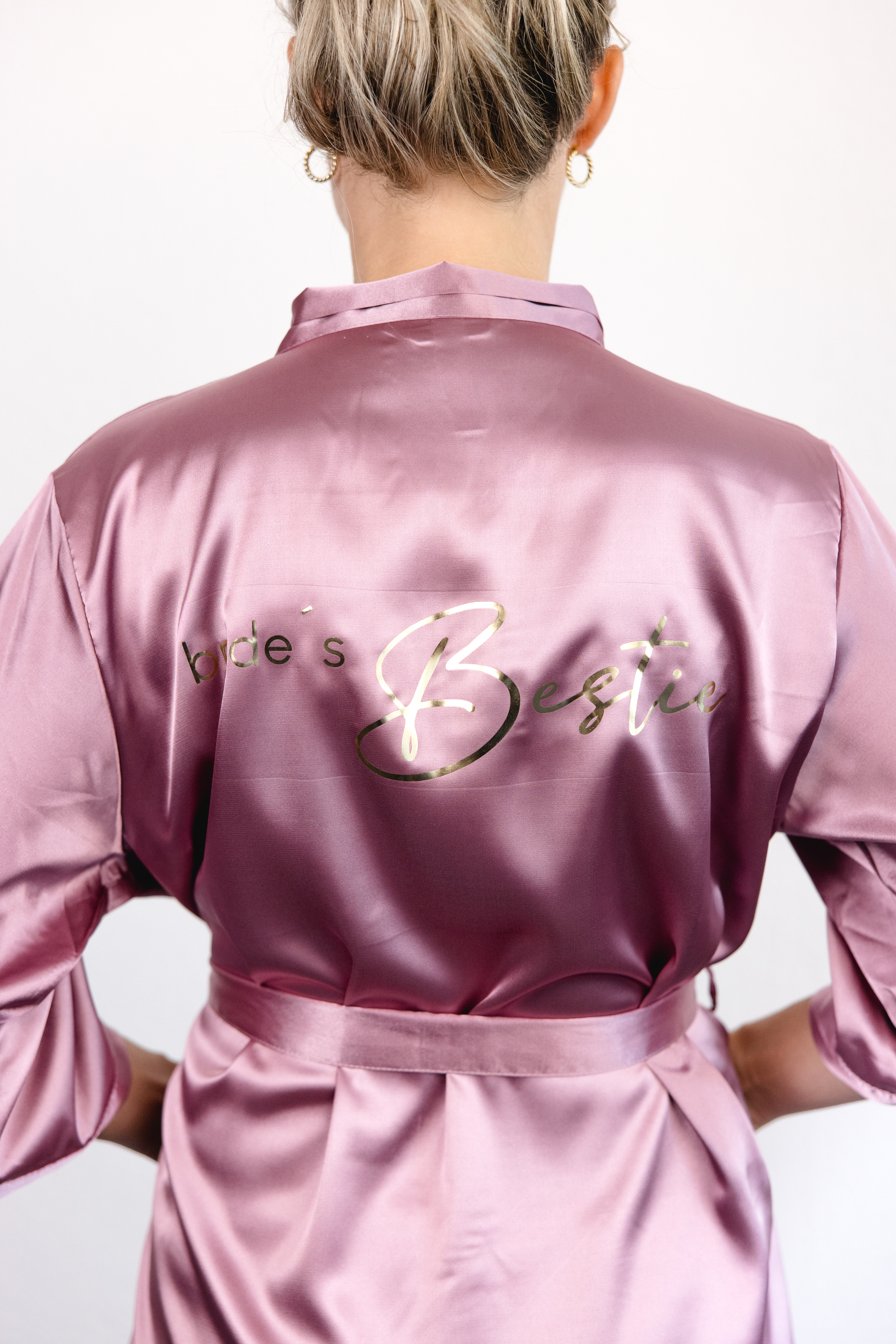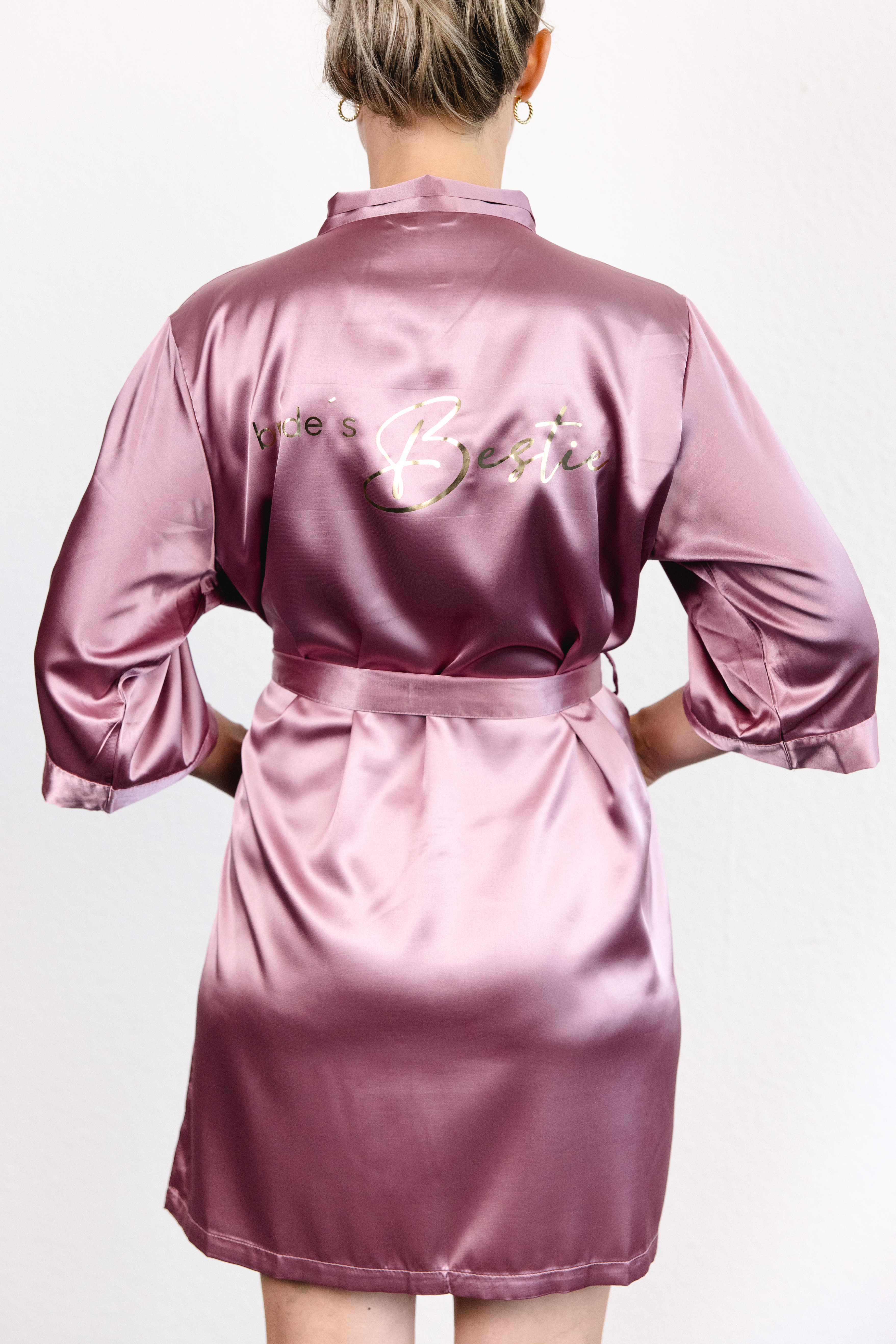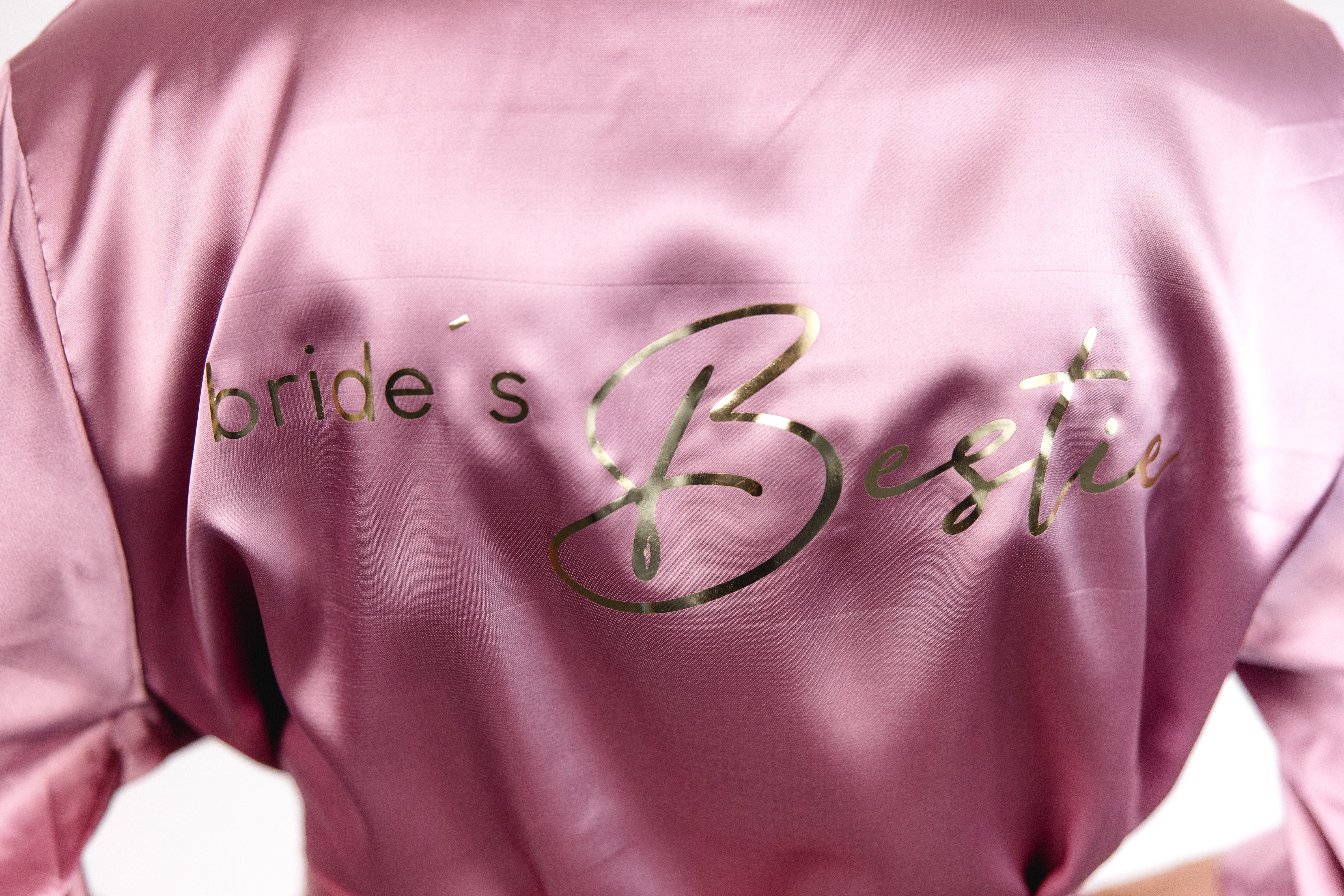 Dieser Kimono ist die perfekte Ergänzung für euer Getting ready zusammen mit euren Brautjungfern. Der Kimono ist mit einem bedruckten Rückenteil veredelt. - Mit goldenem bride´s Bestie-Schriftzug - Mit Bindebändchen - Bis über den Po - 3/4 Ärmel
