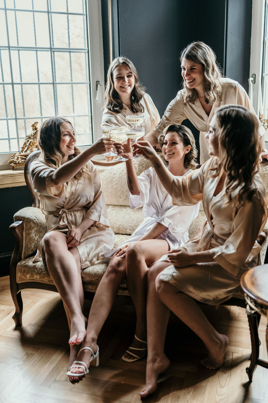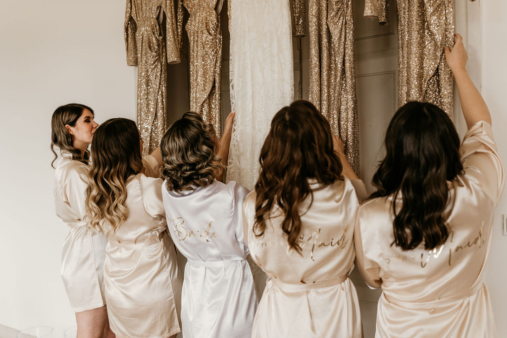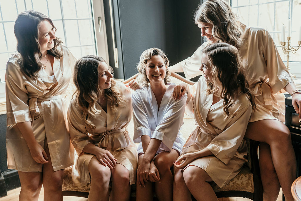 Dieser Bridesmaid-Kimono ist die perfekte Ergänzung für euer Getting ready zusammen mit euren Brautjungfern. Der Kimono ist mit einem bedruckten Rückenteil veredelt. - Mit goldenem bride´s Bestie-Schriftzug - Mit Bindebändchen - 3/4 Ärmel