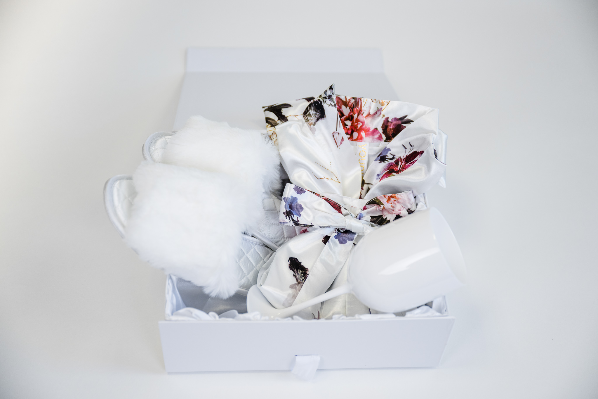 Diese edle Box ist die perfekte Ergänzung für euer Getting Ready! Inhalt: - Kimono weiß mit Blumenprint - Plüsch Slipper weiß - Kelch in den Farben gold oder weiß - edle Geschenkebox weiß
